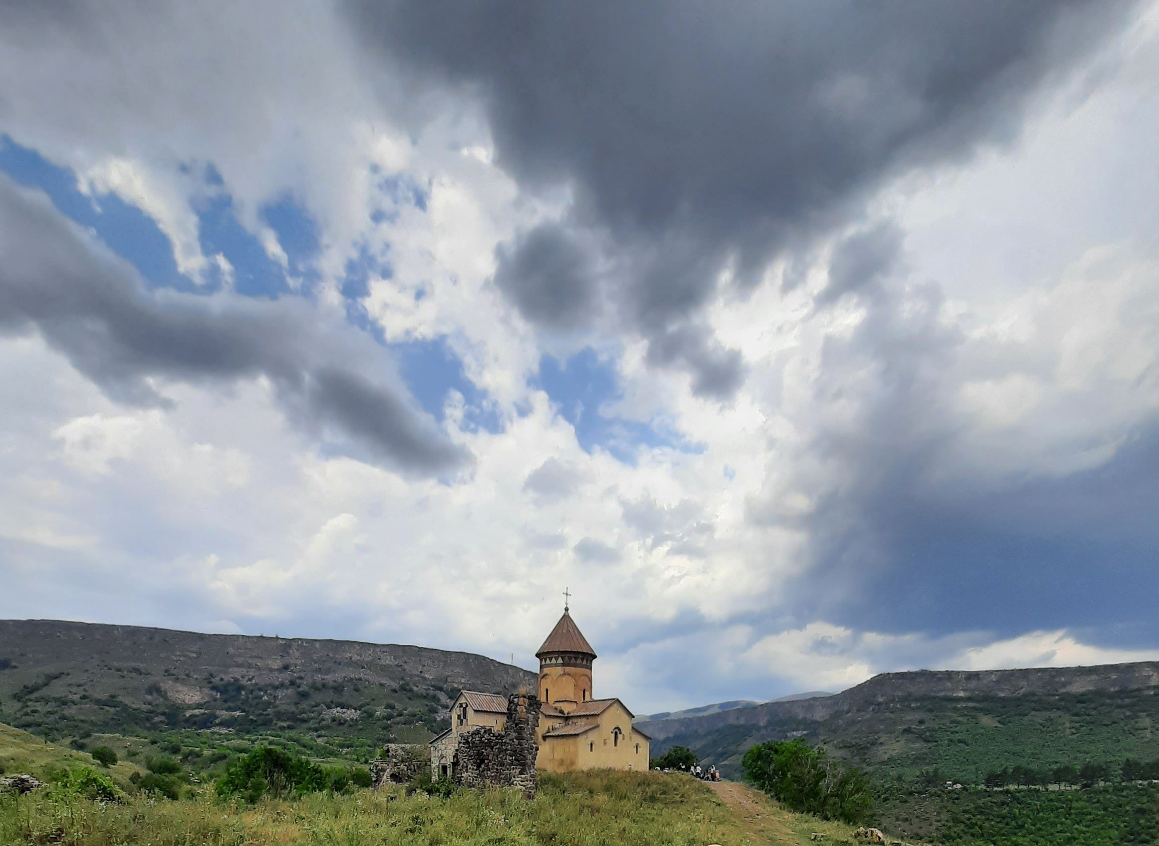 Следующая наша остановка - монастырский комплекс Хневанк, расположенный к востоку от села Куртан, на правом берегу реки Дзорагет. Крестово-купольный храм построен в VII в. из чисто тесаного фельзита; снаружи он имеет прямоугольную форму, внутри – трехапсидный, по углам - ризницы.